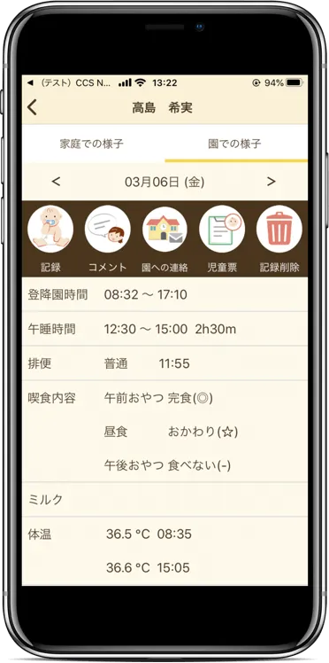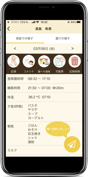 急な予定変更の連絡や、園児のお昼寝時間、ごはんを食べる量、排便の状態などの記録をかんたん操作で行えます。 お迎え前に園での様子を確認できるので、保育士とのコミュニケーションを円滑にし、万が一災害が起こった際の園児の状況を家族全員で確認することができます。