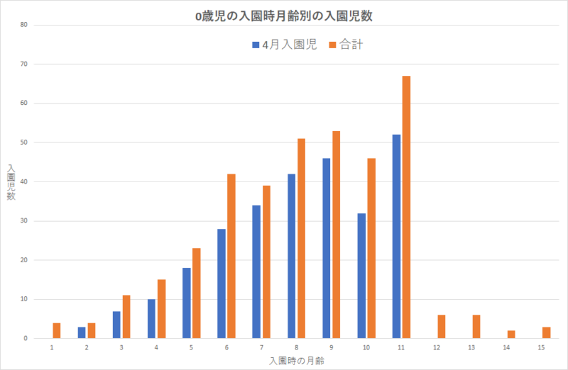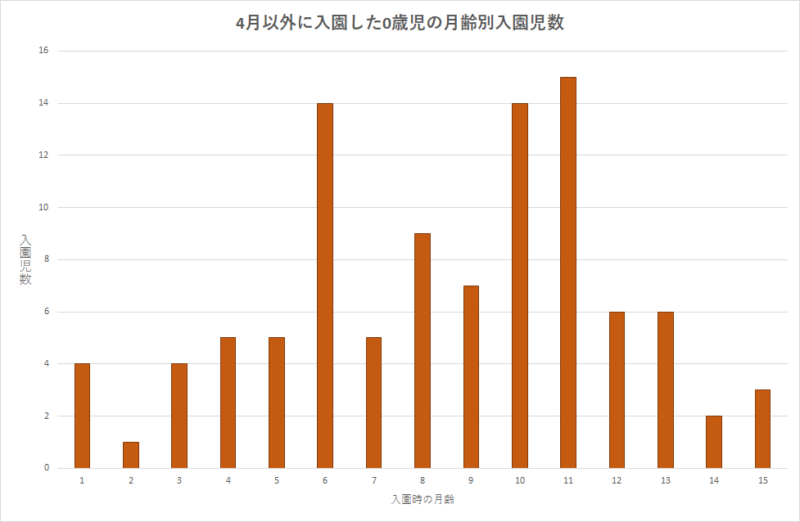 これをみると、4月に入園する0歳児の入園で、4月入園がもっとも多く、0歳入園児の7割以上が4月入園です。と同時に、その入園の時点での月齢は、均等に分布しているのではなく、月齢6ヶ月以上、特に、9ヶ月、11ヶ月に偏っているということも見て取れます。