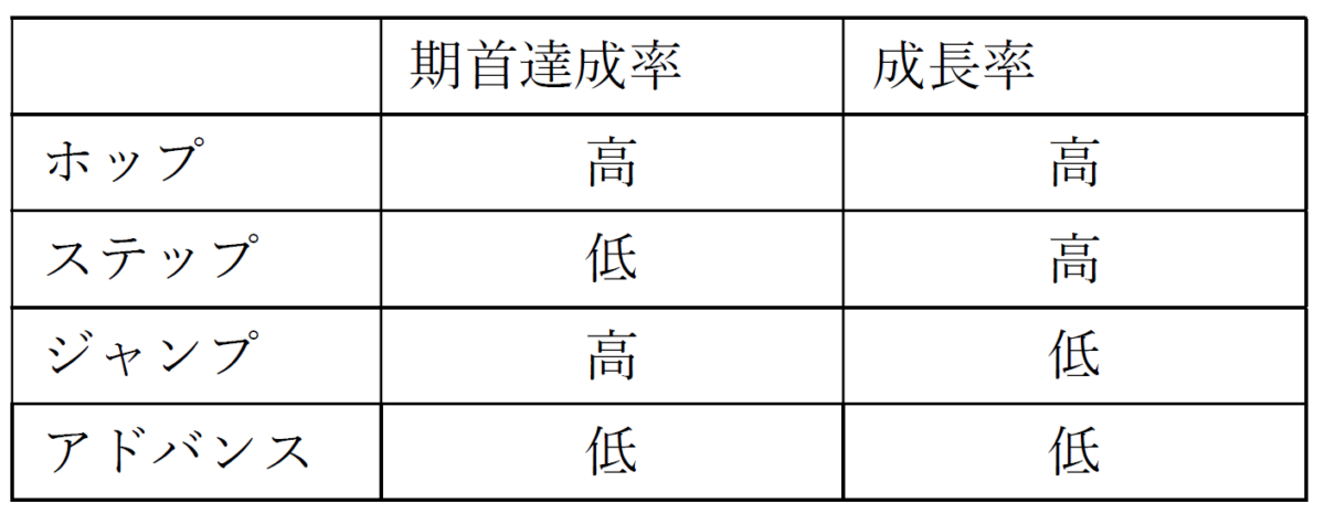冒頭で述べましたように、この4分類と、期首達成率/成長率の高低の関係を表にすると、次のようになります。